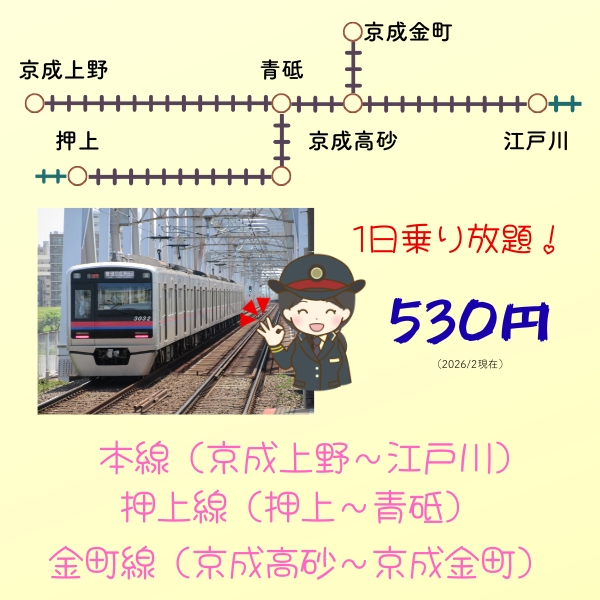 フリー区間は、本線江戸川駅 までに押上線全線、途中の 京成高砂駅 から分かれる金町線の 金町駅 までです。