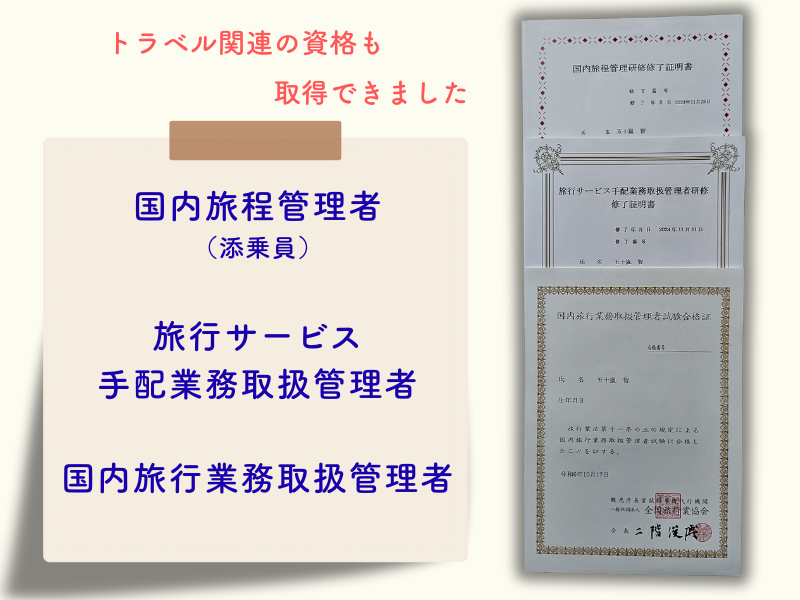 退職後に、申込んだ「トラベル系職業訓練校」への通学がハローワークより認められ、有り難いことに手当を頂きながら3か月間、旅行や添乗員のことを学ぶ機会に恵まれました。