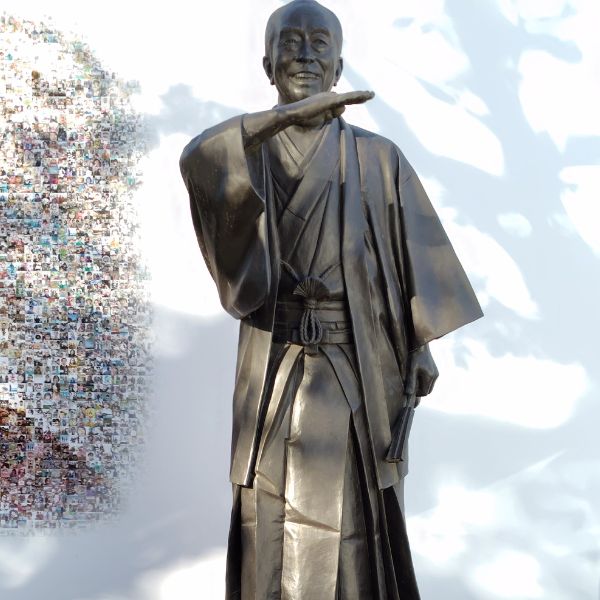 銅像とモザイクアートの志村けんさん、このモザイクアートは全国から寄せられた約1000枚の写真で創られています。