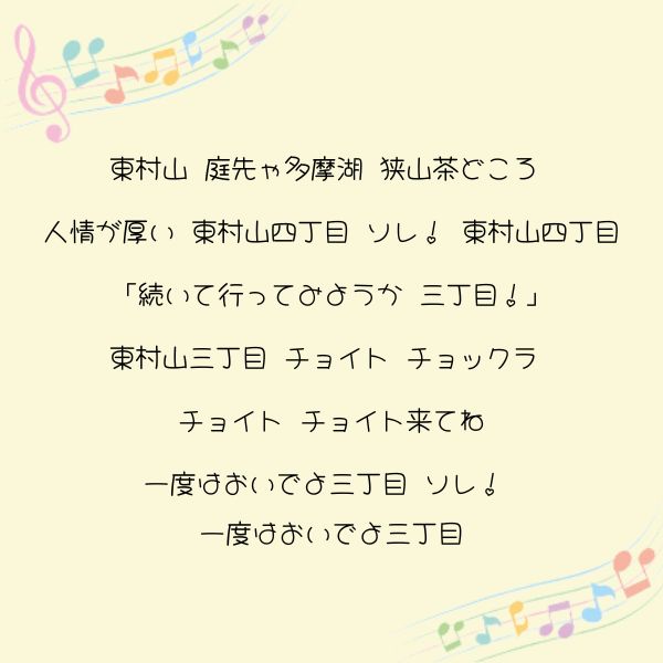 東村山~♪ 庭先ゃ多摩湖 狭山茶どころ 人情が厚い東村山四丁目♪