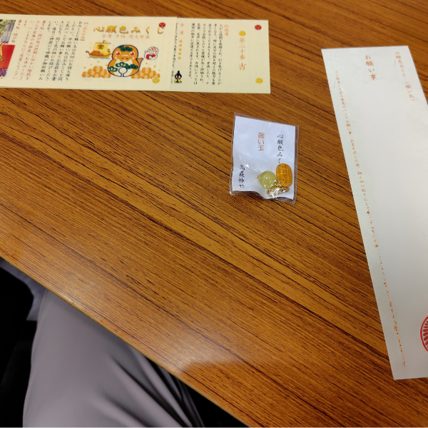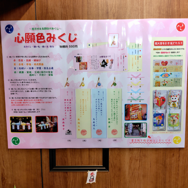 参拝を終えたあと、授与所へ向かい、おみくじと一緒に願掛けができる「心願色みくじ」を授かります。